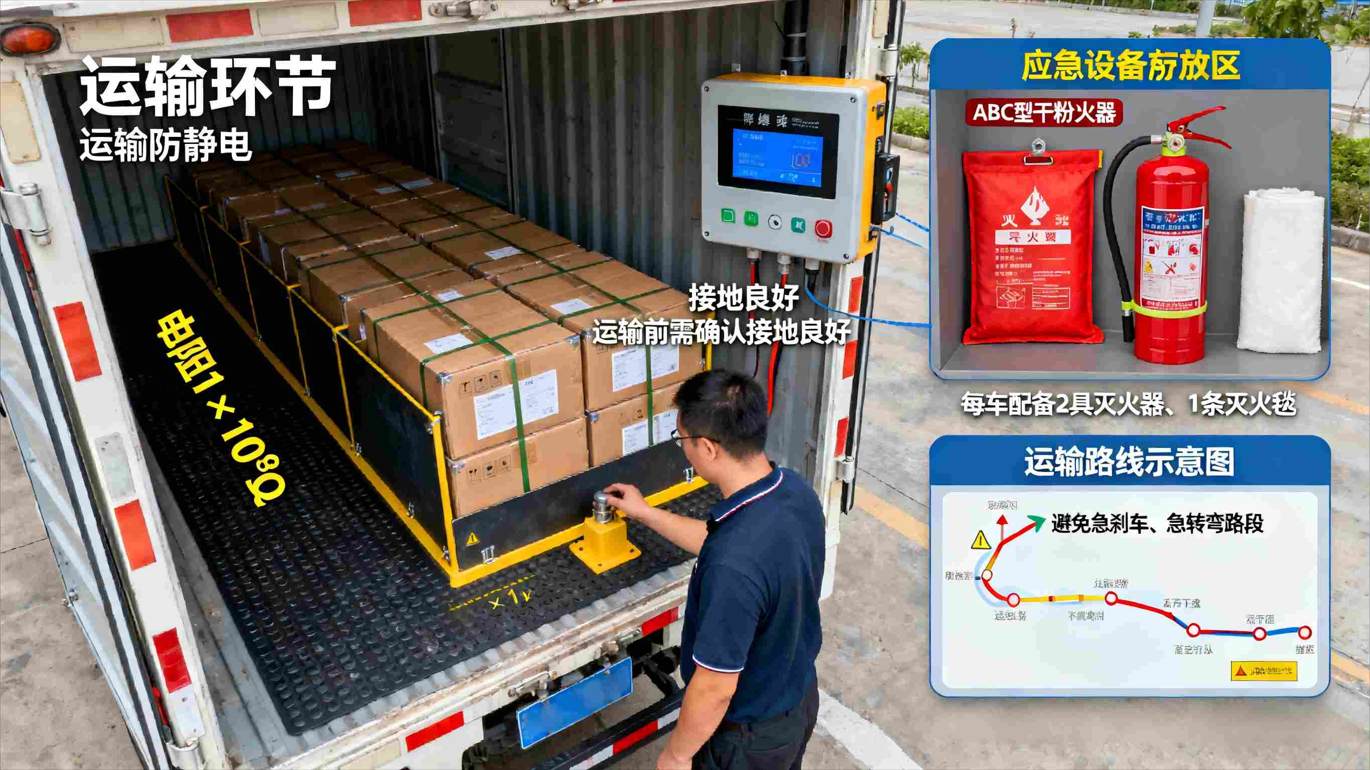 3.运输环节:运输车辆需采用防爆型货车,车厢内铺设导静电橡胶板(表面电阻值 1×10⁶-1×10⁹Ω),且橡胶板需与车辆底盘接地;货物装载时,需轻拿轻放,避免碰撞摩擦,且成品箱之间需用导静电隔板分隔,防止产生静电;运输车辆需配备静电接地报警器,行驶前需将接地带与地面接触,确保接地良好;运输过程中,禁止急刹车、急转弯,避免因货物晃动产生静电;运输车辆需配备灭火器、灭火毯等应急设备,且驾驶员需经过防静电安全培训,掌握应急处置技能。
