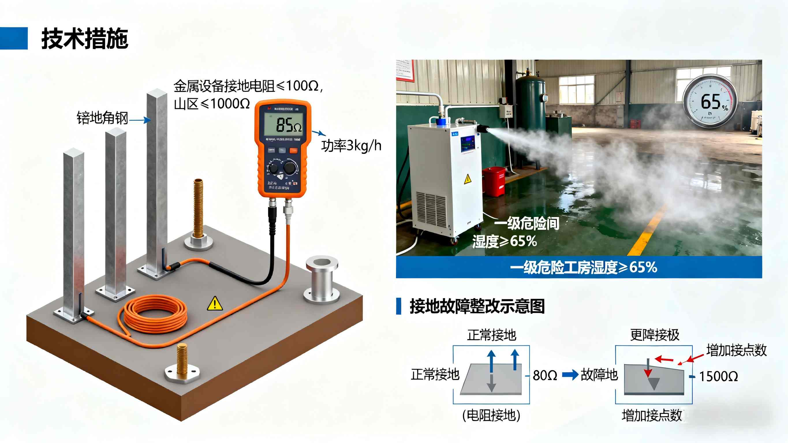 误区一:冬季车间有暖气,不需要加湿。纠正:暖气会导致车间空气湿度进一步降低,加速静电积累,必须按规范要求配备增湿设备,维持湿度在 60% 以上。