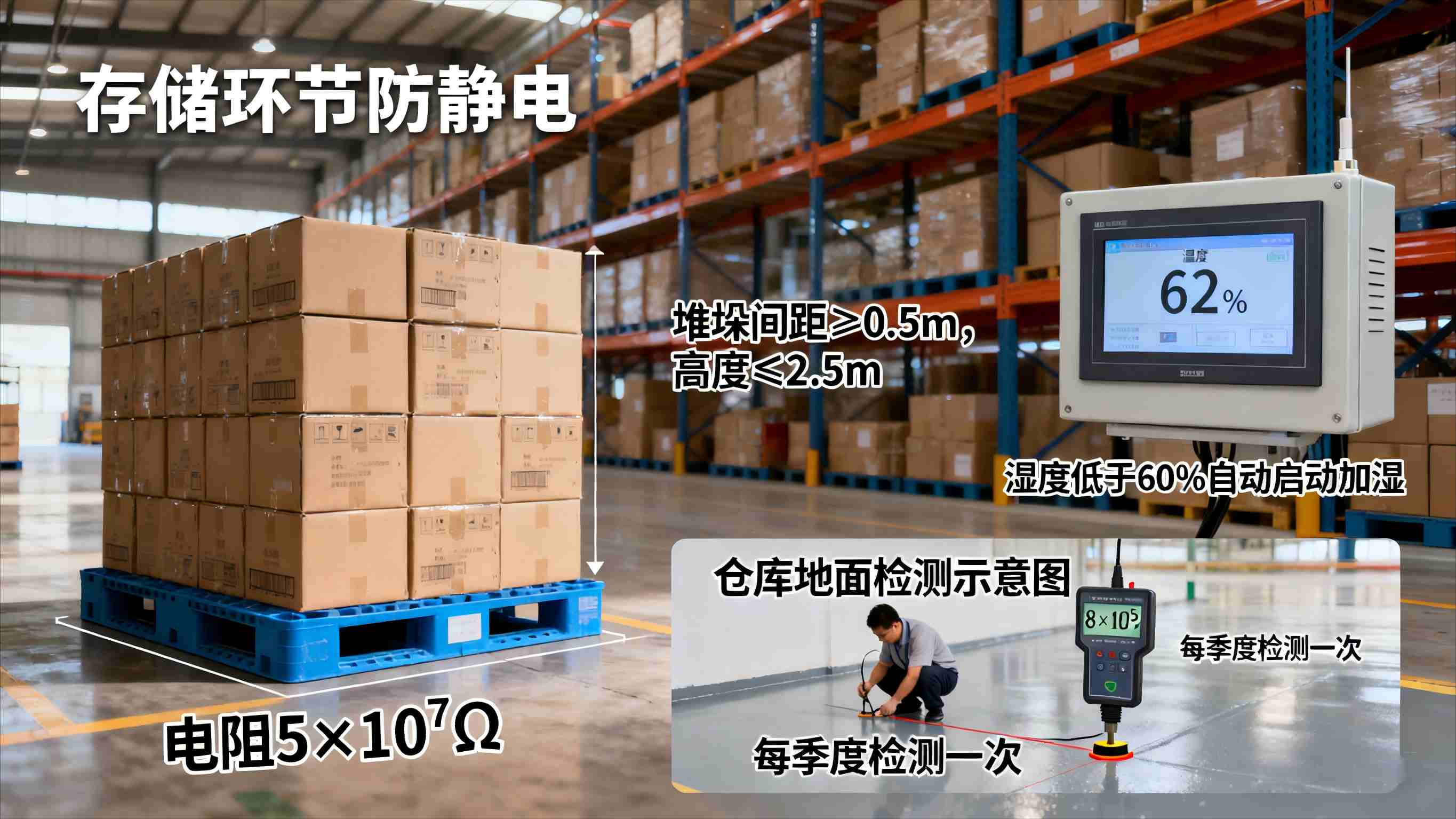 2.存储环节:成品仓库需划分独立的存储区域,每个区域的存储量不超过 500 箱,堆垛间距≥0.7m,堆垛高度不超过 2.5m;仓库地面需采用防静电环氧树脂地坪(表面电阻值 5×10⁴-1×10⁹Ω),每季度需用表面电阻测试仪检测一次,不合格的立即修复;仓库内需安装防爆型温湿度传感器,实时监测湿度,当湿度低于 60% 时,采取加湿措施;仓库内禁止使用非防爆电器。