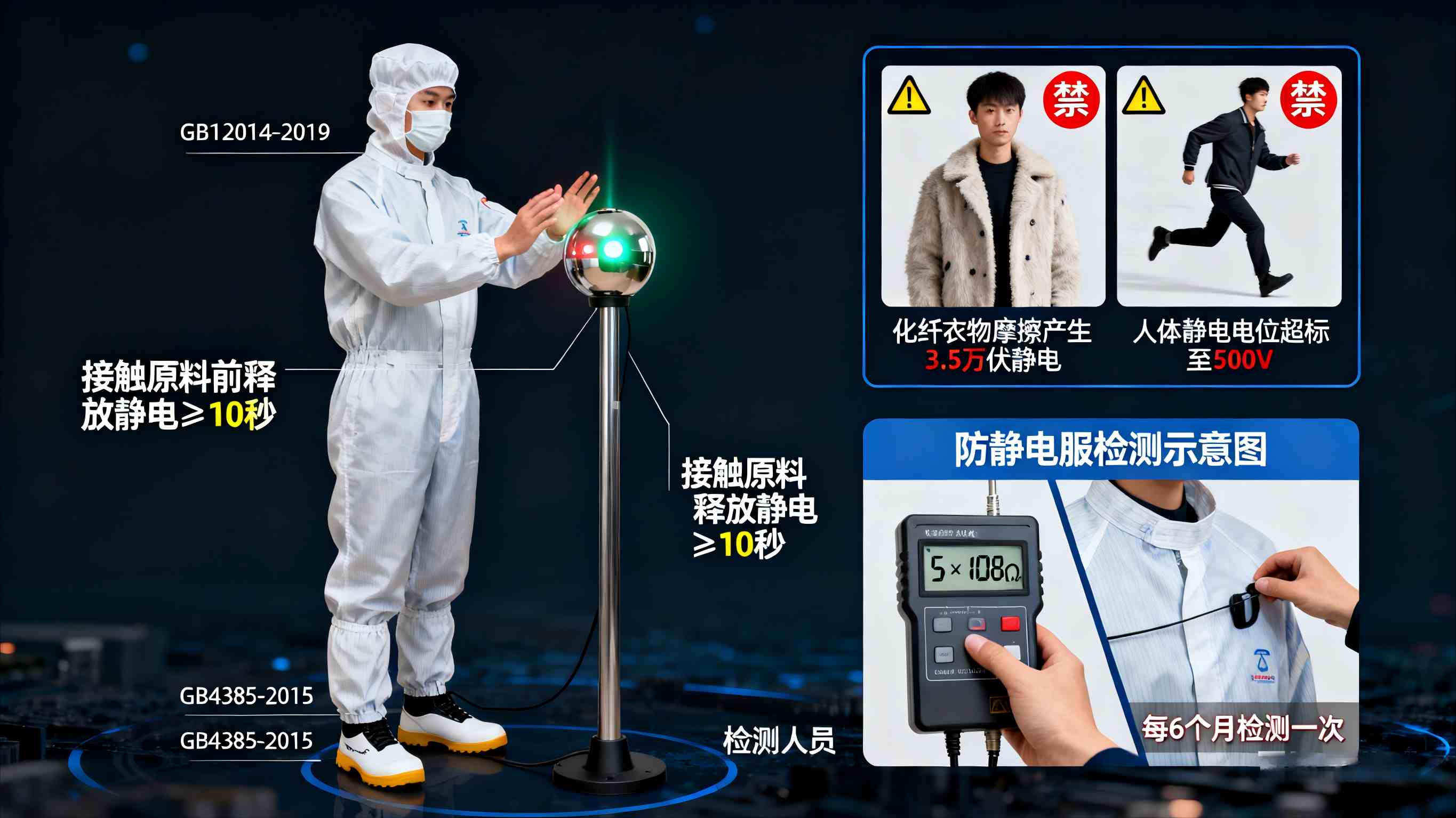 - 防护设备管理:静电释放球需每周清洁一次,去除表面灰尘和油污,确保接触良好;车间内禁止携带手机、钥匙等金属物品,避免因摩擦产生静电。